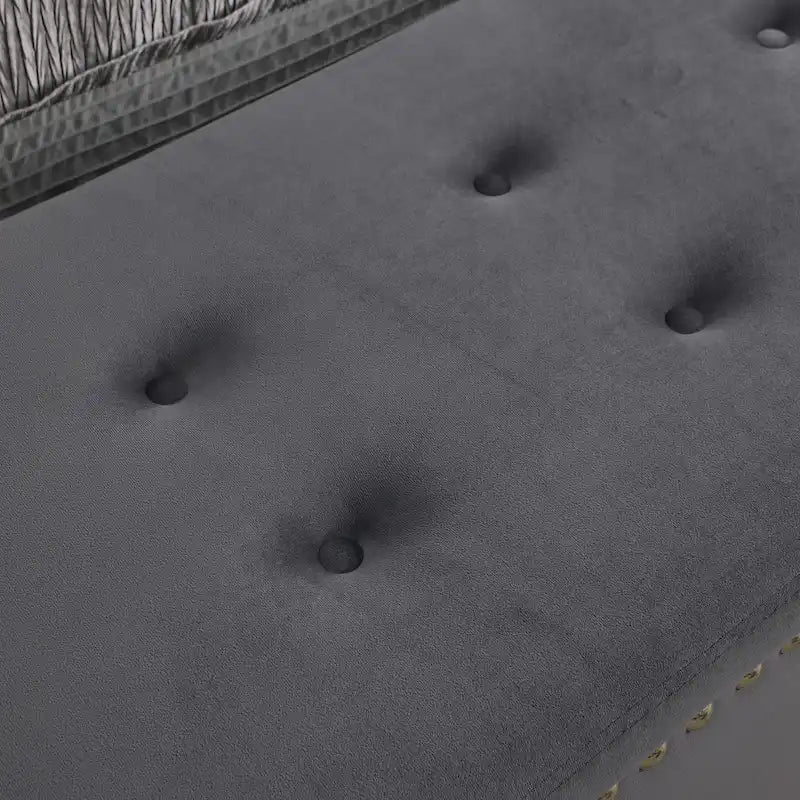 - This unique piece features a large bench with ample storage space, perfectly complemented by a smaller bench nestled inside. Both benches are adorned with a plush velvet finish and elegant nailhead trim, adding a touch of sophistication to any room.