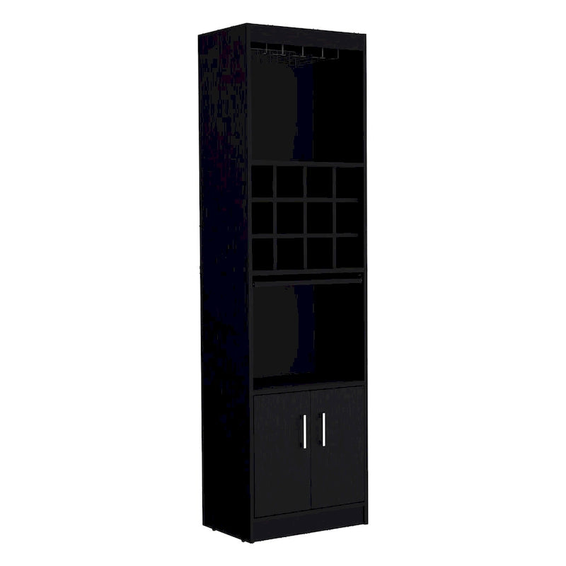 - Features: Double Door Cabinet, 12-Bottle Wine Rack, 12 Stemware Slots, 4-Line Stemware Rack, Pull-Out Tray, 5 Shelves