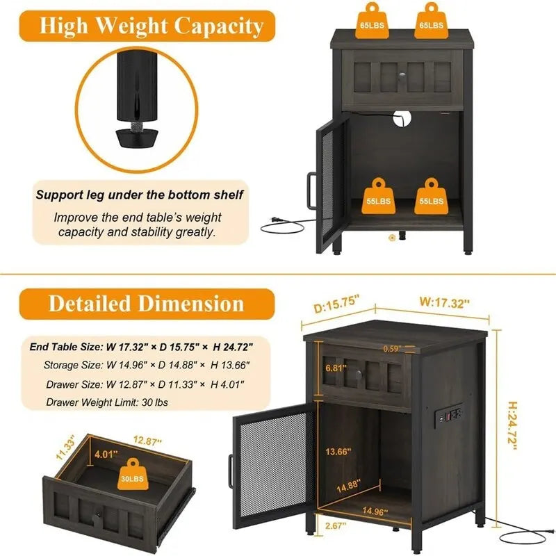 - The added drawer ensures ample storage, keeping essentials organized and surfaces clutter-free, while enhancing the table's practicality and farmhouse aesthetic. The bottom of the side table features a mesh door, offering a hidden space to effectively organize and conceal clutter. With its versatile design, this bedside table serves multiple purposes, functioning as a printer stand, small nightstand, bedside table, sofa side table, accent table, and more.