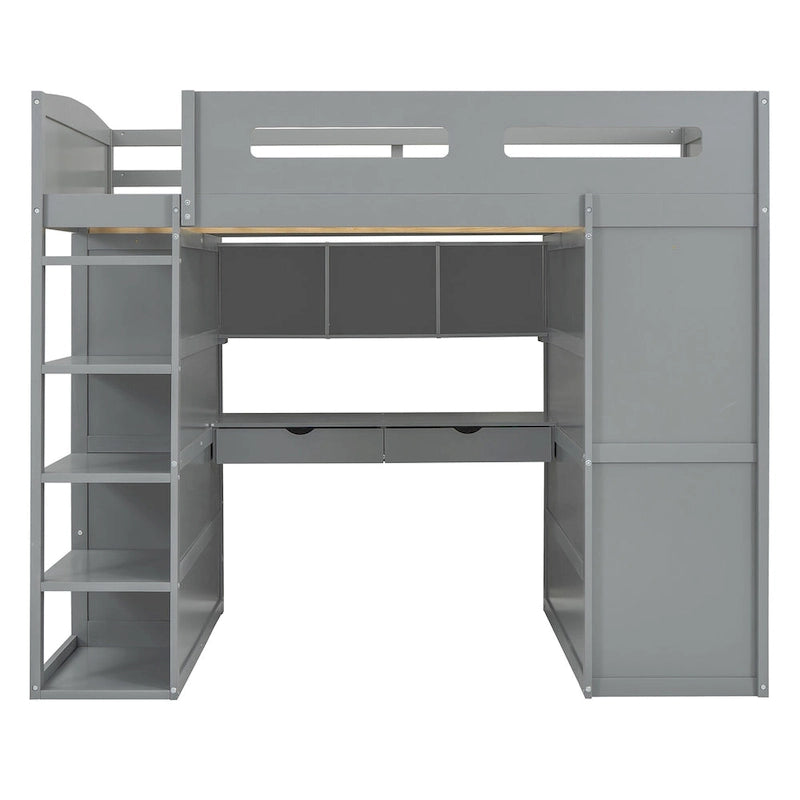 - Transform your bedroom into a multifunctional space with our loft bed, available in twin and full sizes. This stylish and practical loft bed comes in sleek white or gray and features a built-in desk with a top shelf, two drawers underneath. The left side boasts a four-tier shelf and two more drawers for all your office and storage needs, while the open closet on the left can hold your clothes or luggage. On the right side, a large built-in wardrobe with hanging rods provides ample space for all your garments. This loft bed is the perfect solution for maximizing space and adding modern style to your room.
