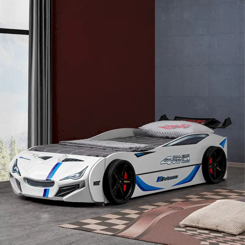 Ignite your child's imagination with this twin-size race car bed, available in bold red or classic white. Featuring a high-gloss finish, realistic wheel rim details, and a handy pull-out trundle for sleepovers, this bed combines playful style with practical storage. Sturdy 11-slat support means no box spring is needed-perfect for energetic kids and dreamers alike!