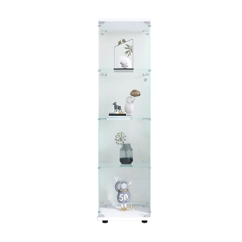 Glass Display Cabinet: Size 64.7(H) x 16.7(L) x 14.3(W) inches, each tempered glass is 4mm thick. 4-shelf design is sturdy and stylish to display photos, books, action figures, wine and whisky; glass door is easy to open and close. Three colors available: White, Black and Natural Wood