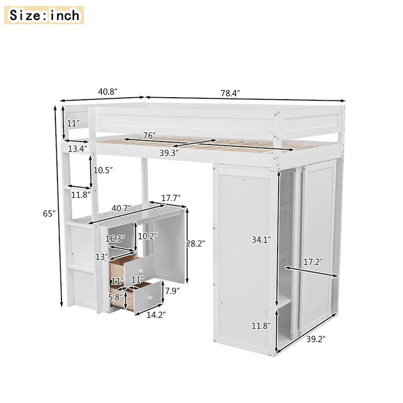 - [Storage Space] This loft bed is made up of several pieces: a bed, a desk, a wardrobe, 2 drawers and an open storage cabinet. It can completely store your work and daily necessities.