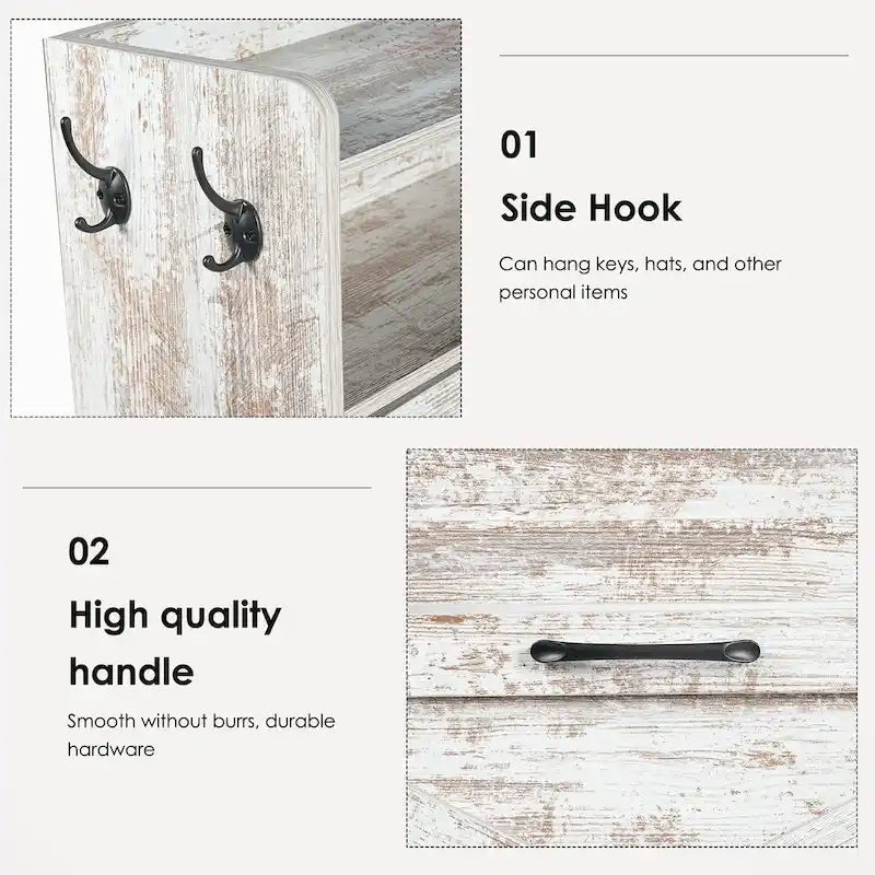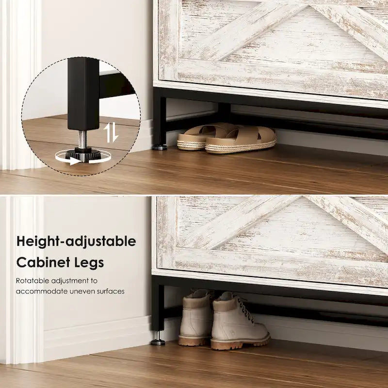 Featuring a classic farmhouse style, this shoe storage cabinet comes with 2 flip drawers, each designed with 2 layers of adjustable shoe slots to accommodate a variety of shoe sizes.