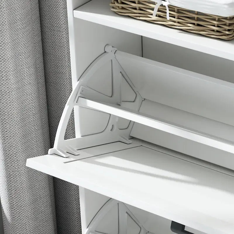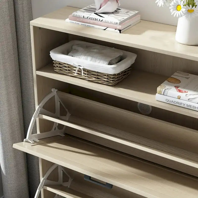 2 flip drawers with adjustible shelves can store for 12-16 pairs of Shoes.Adjustible shelves features a removable divider in each compartment, you can choose to keep or remove the panel according to the size or style of your shoes.