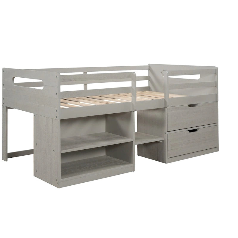 Solid Wood Twin Size Loft Bed with Dual Shelves and Two Drawers for Storage