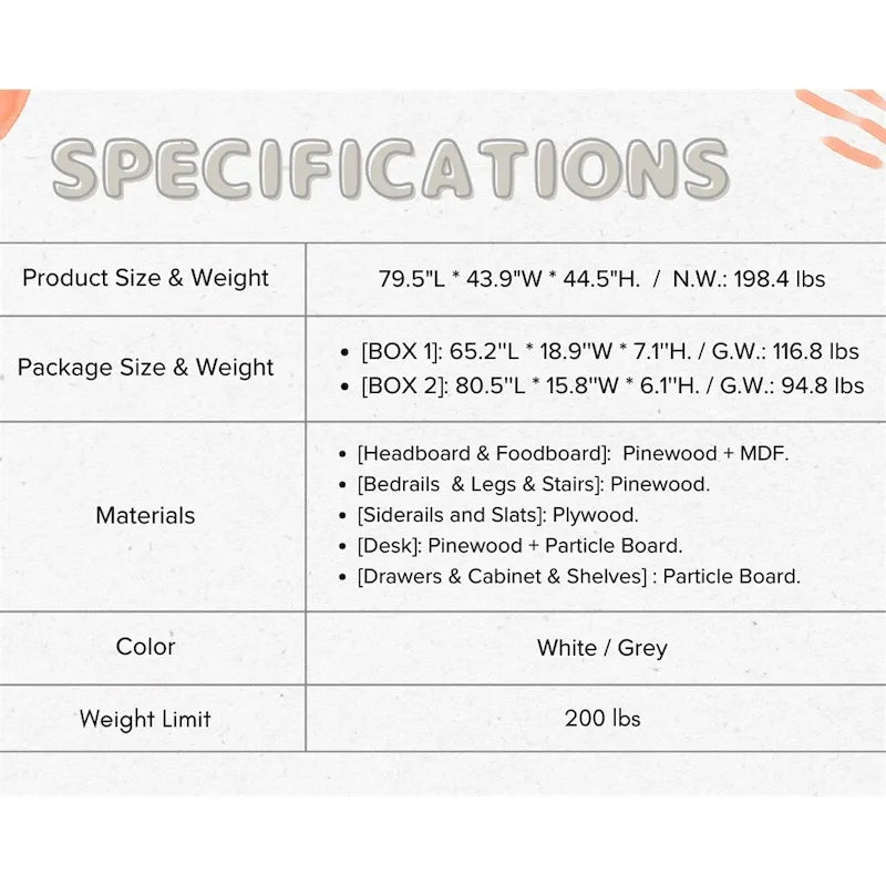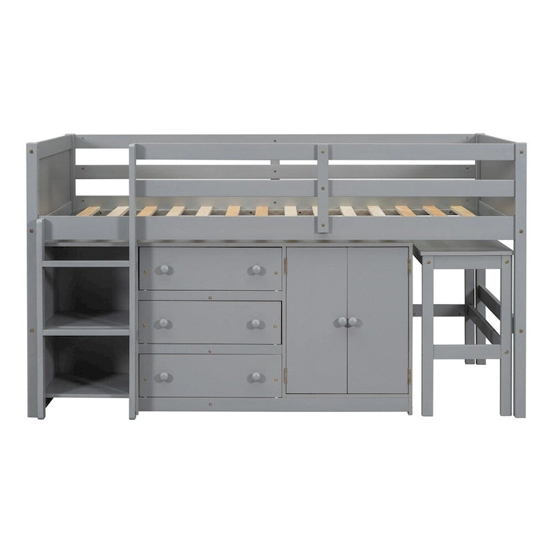 - [Kids Twin Loft Bed With Multifunction]- The low loft bed with a retractable desk provides great convenience for studying and drawing. Also, the loft bed with a cabinet, 3 drawers, and 2 shelves in front of the loft bed provides an organized haven for books, toys, bedding, or any other items to stock.