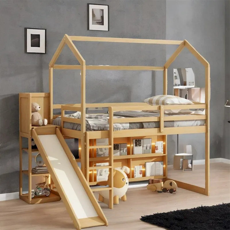 This house Loft bed with trundle is designed with a clean silhouette and a hue of elegance.It suits all styles of home decoration, and completes the look of any bedroom. Crafted with a whimsical playhouse design, comes with slide and storage shelves, this loft bed offers you a comfortable and exhilarating experience during both sleep and playtime that will let your imaginations run wild.
